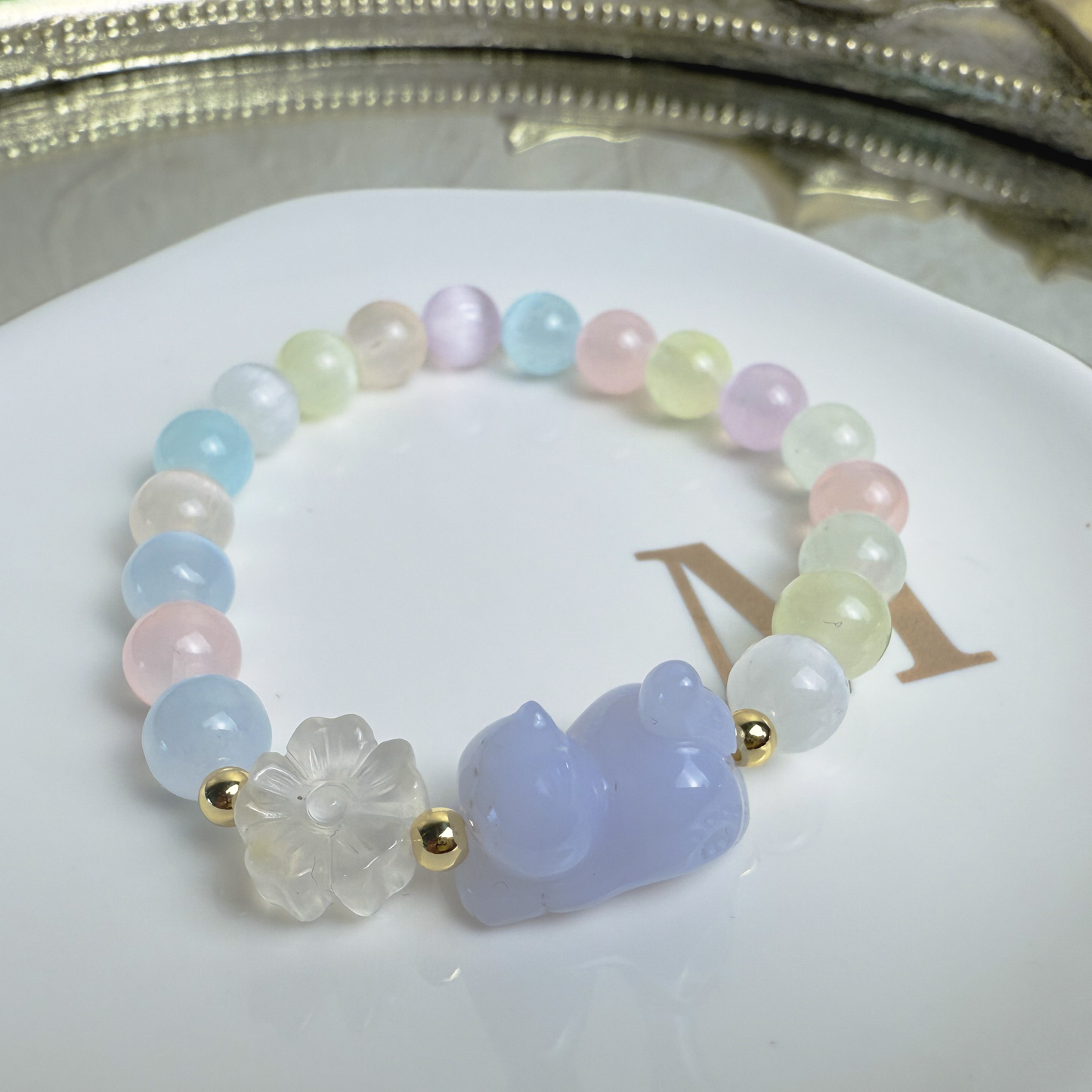 Carved blue chalcedony kitty charm, carved agate sakura charm & rainbow cat-eye agate bracelet (~8mm)