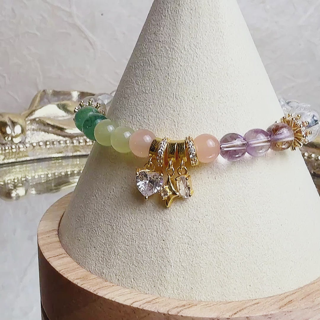 White quartz, green strawberry quartz, orange agate, prehnite, amethyst