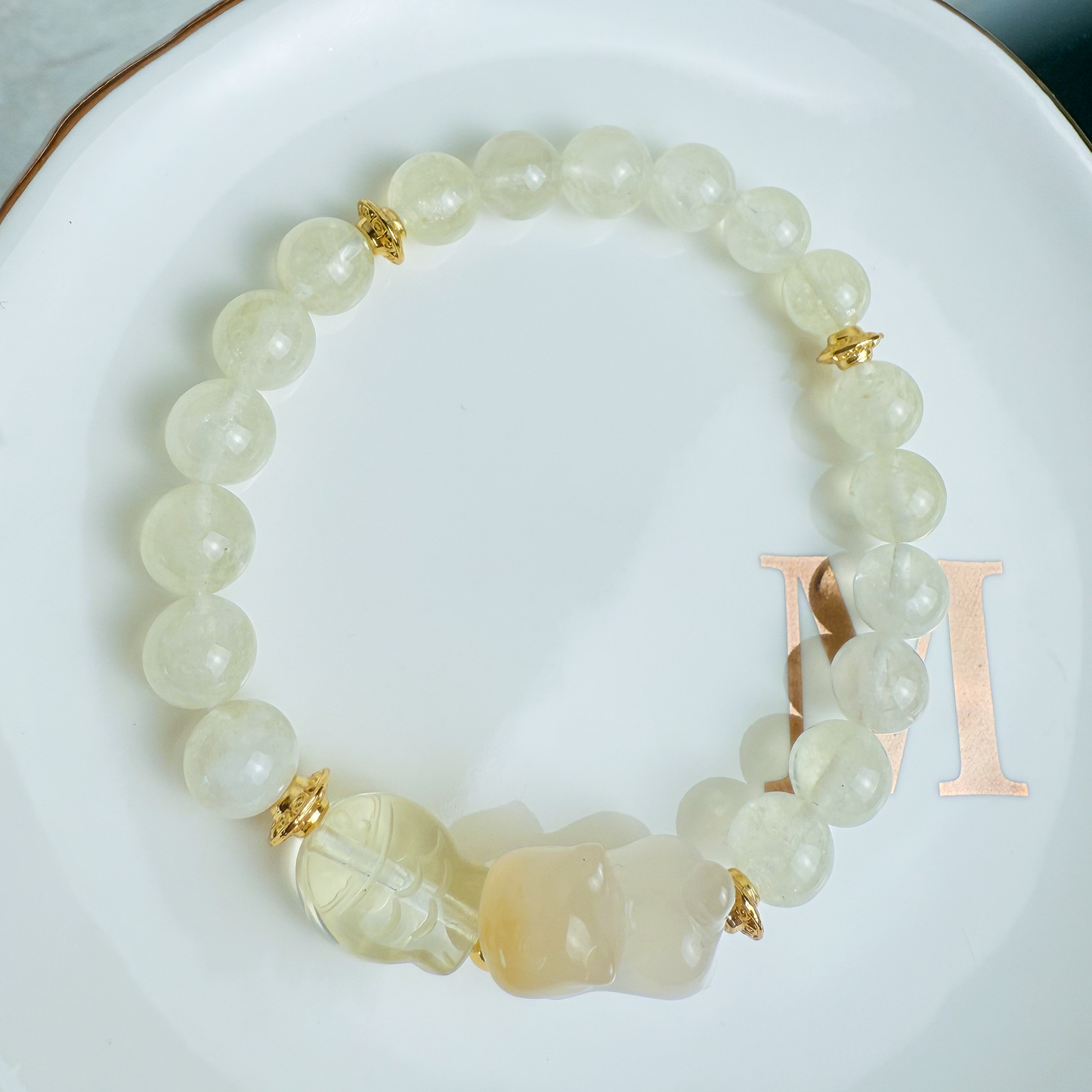 Carved agate walking kitty charm, fish charm & lemon quartz (~8mm)