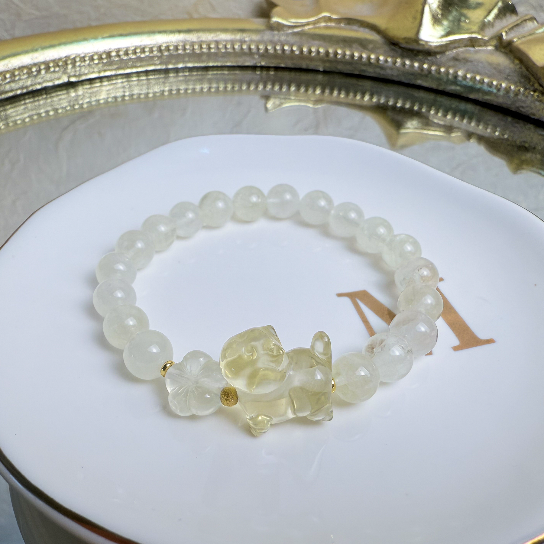 Carved agate walking kitty charm, flower charm & lemon quartz (~8mm)